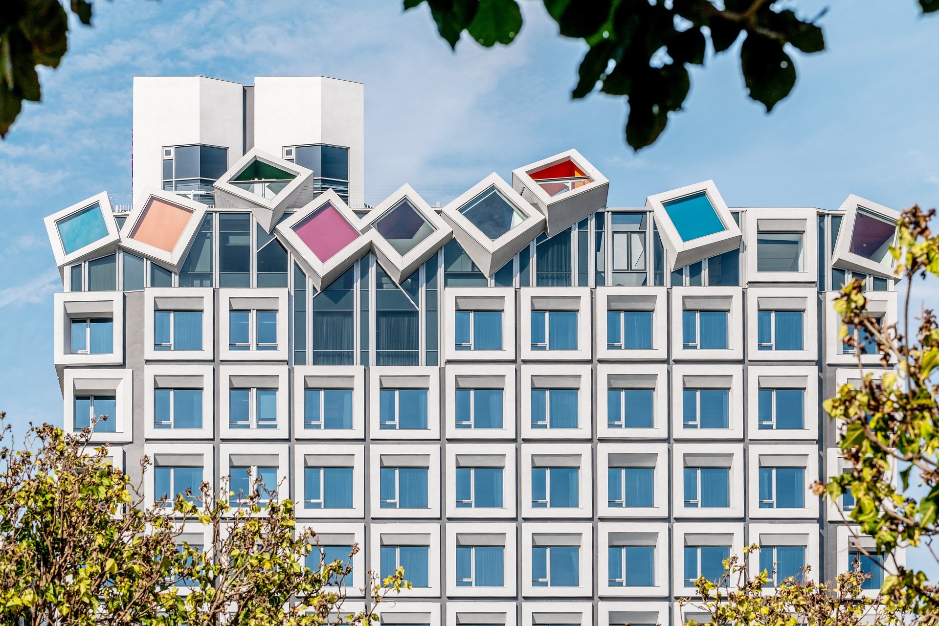 ホワイトを基調とした客室では、照明を覆うライン状のブラックのメタルパーツが「中」という文字を巧みにフロアに映し出しています。また、大きな窓からは都市の光と美しい風景を楽しむことができます。