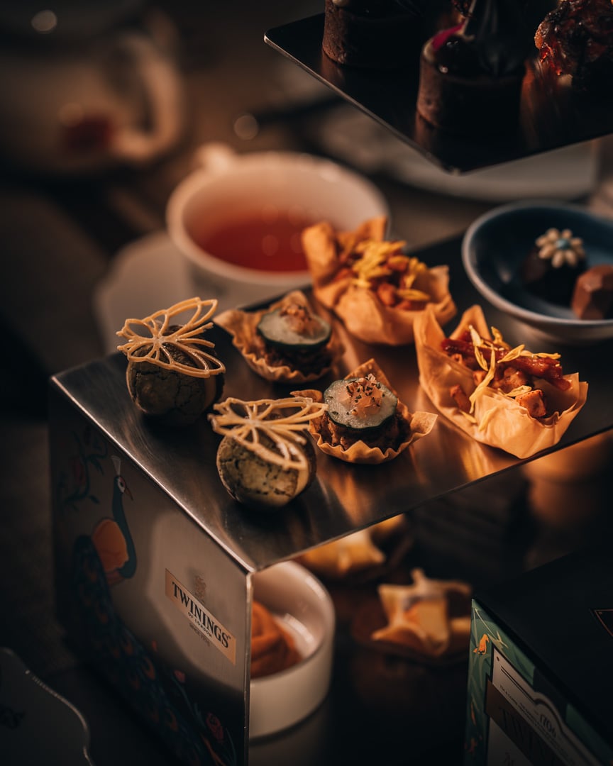 鉑金系列胭脂莓果茶則化作「莓果起司球佐莓果茶凍」與「黑金 TWININGS 胭脂莓果夾心酥」,酸甜莓果香於口中交織,留下令人難忘的韻味。「TWININGS 薄荷圓舞曲巧克力塔」以鉑金系列薄荷圓舞曲點綴,口感清新怡人;「TWININGS 薑芒綠茶慕斯米香塔」以薑芒綠茶研磨成細緻茶粉融入慕斯,結合芒果果香、薑味辛香與綠茶爽冽,展現豐富層次。