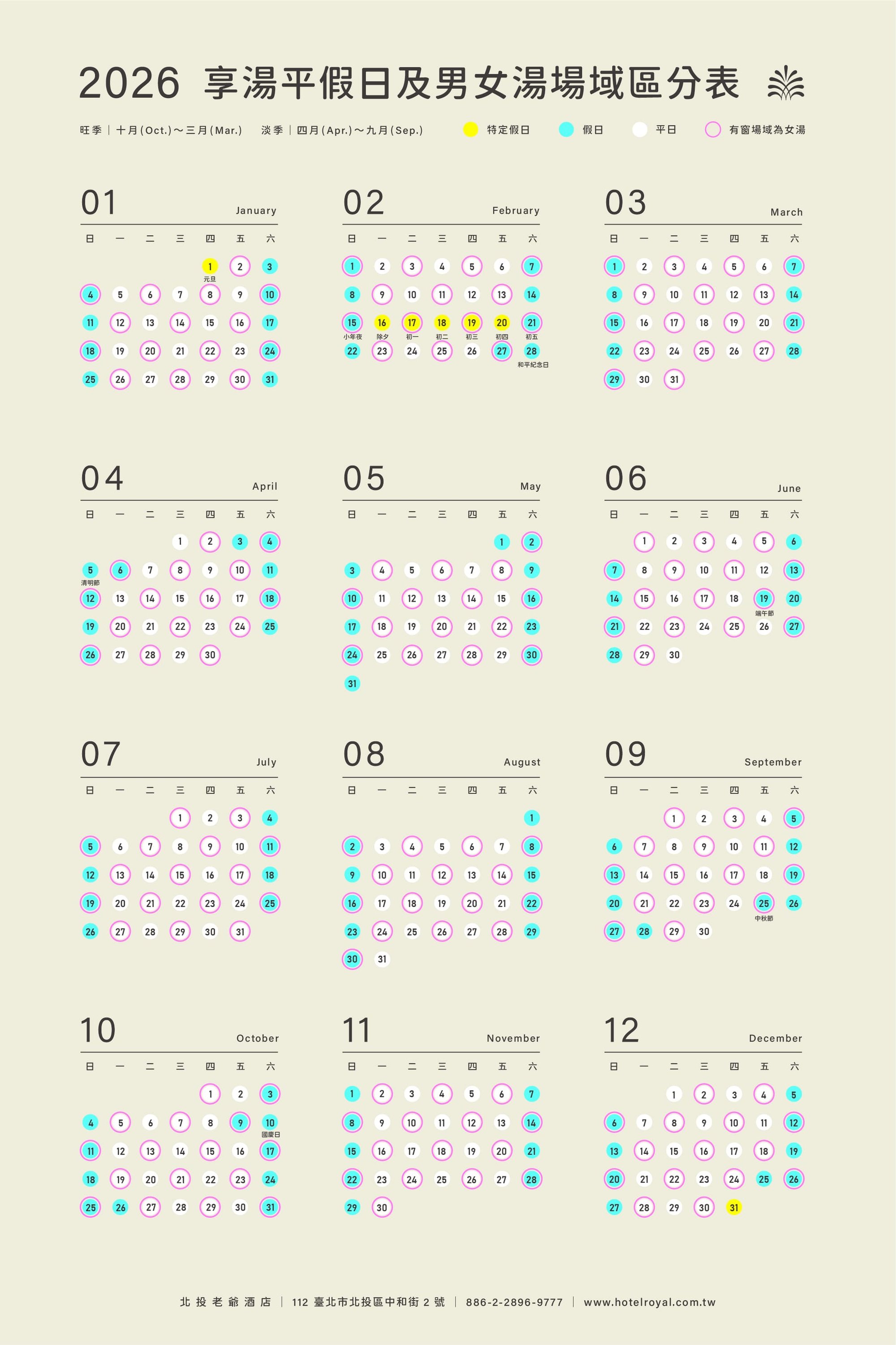 2026年、2027年1~3月|北投老爺酒店|住房平旺假日區分表
