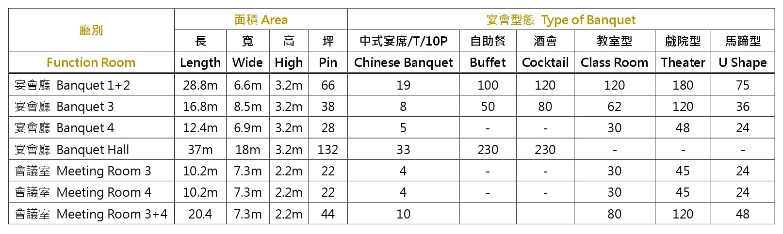 宴會廳/會議室容量