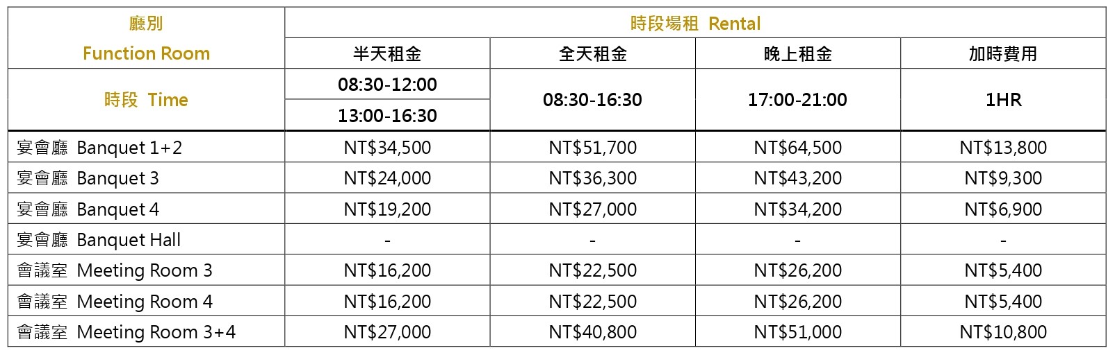 - 場地提早進場或是延長離場,皆會收取加時費用,不足一小時以一小時計。