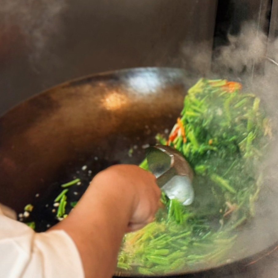 鍋緣熱氣翻滾,鐵鏟敲擊的節奏。師傅以快火翻炒,保留空心菜鮮甜。鍋氣混著蒜香,簡單卻真實。