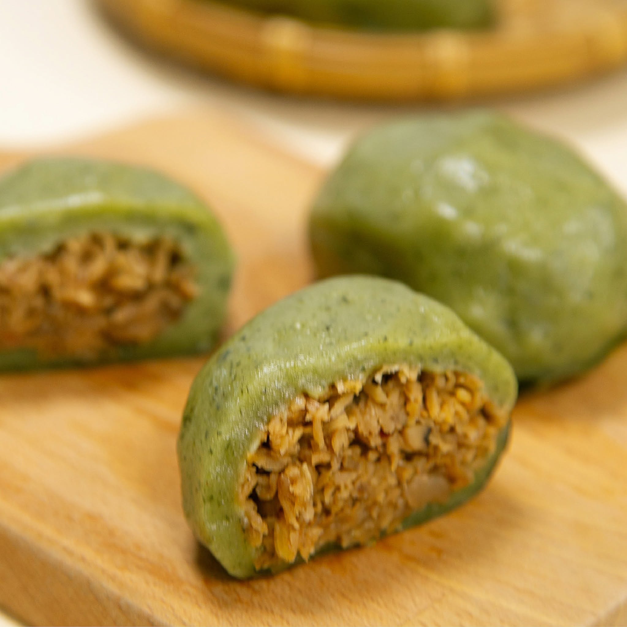 是臺東隱藏版客家點心,草仔粿外皮揉入自種香艾草的汁液,蒸煮而成,呈淡綠色、軟Q帶草香。