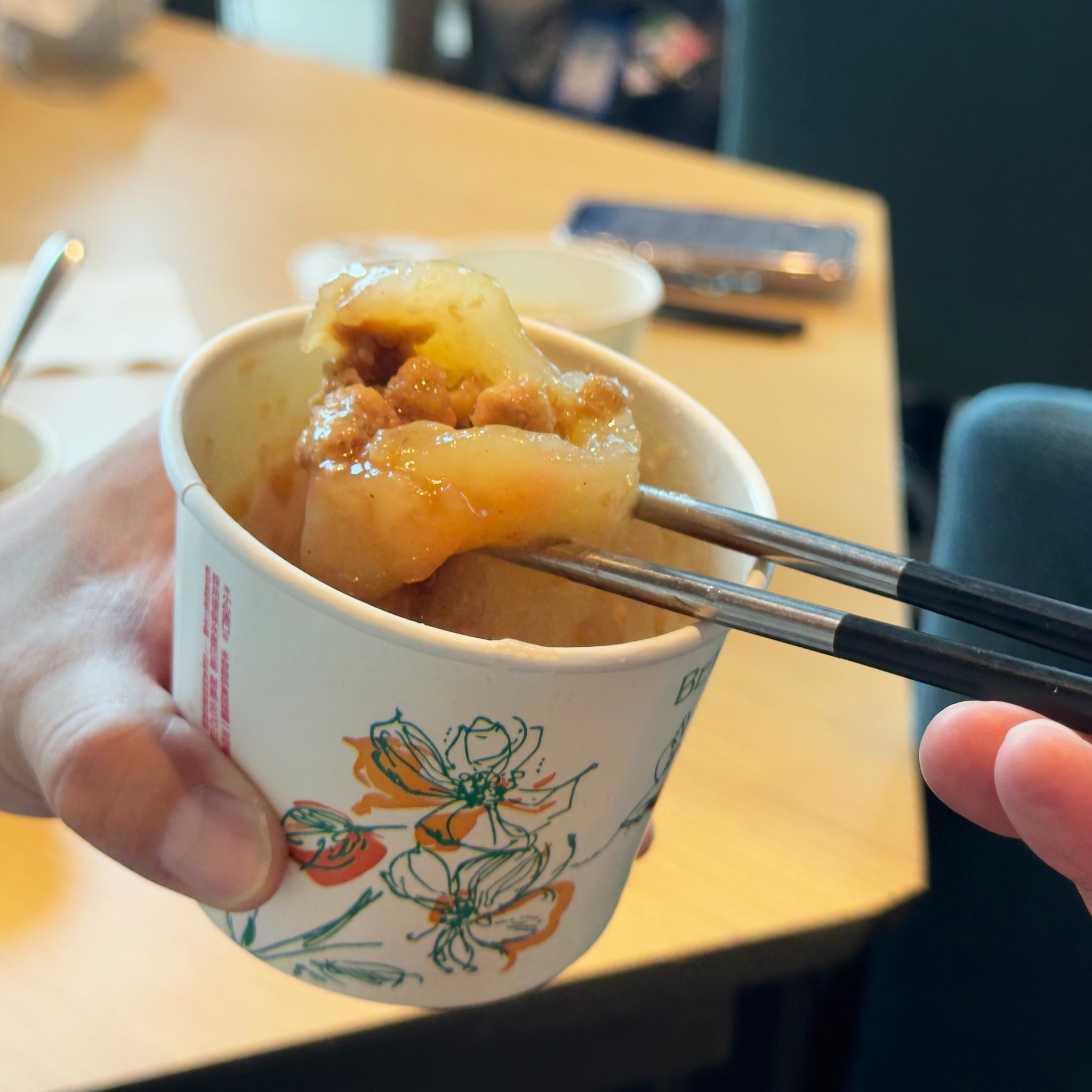 新鮮現做,外皮Q彈晶透,包裹飽滿筍丁與豬肉內餡,佐上特製蒜蓉甜辣醬,香氣層層堆疊。