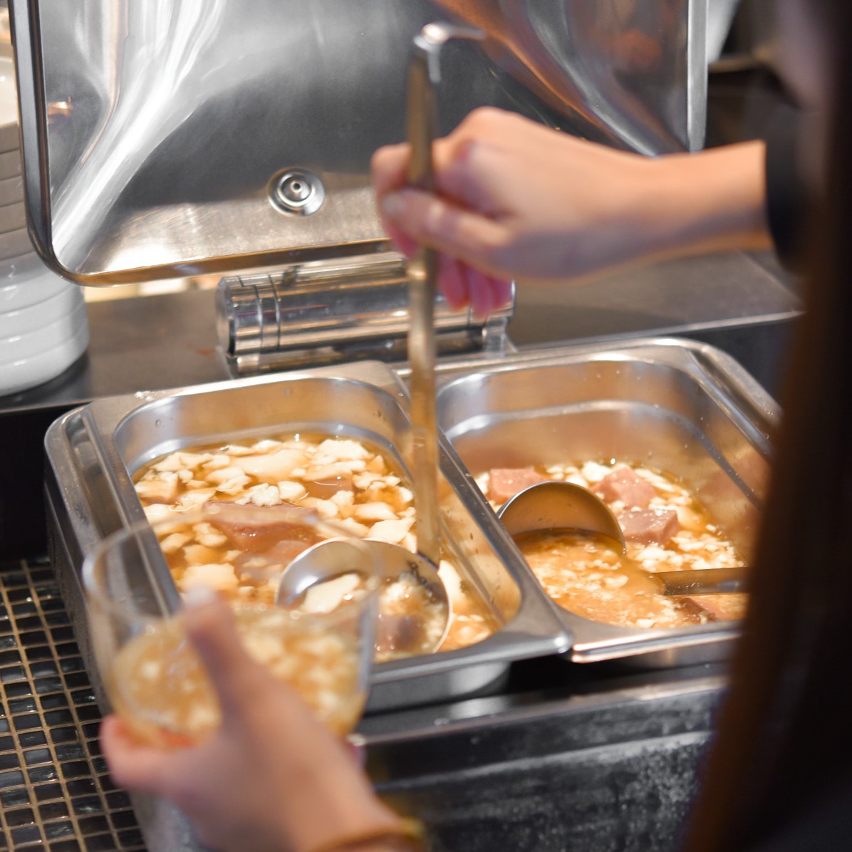 現磨黃豆香氣濃郁,豆花口感細滑綿密,熱騰騰入口,帶著微甜香的層次,保留豆香最純粹的風味。
