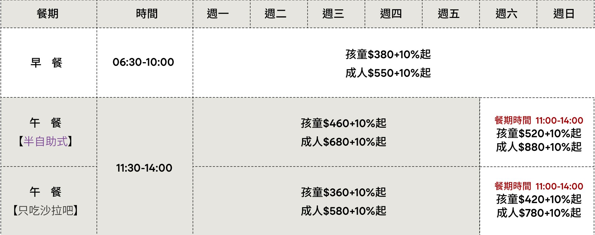 - 臺灣光復節:10/24(五)午餐至10/26(日)午餐,以假日餐價收費。