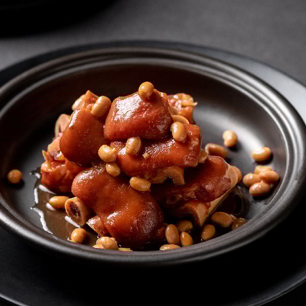 一開鍋就能從香味感受到美好散發,經過主廚細心處理,將黃豆泡水8小時稍稍煮到脫模,再熬到軟爛帶肉鮮味;豬腳則氽燙後爆香,再加入白糖拌炒至溶化呈現淺棕色,熬煮約兩小時入味收汁,直到色澤亮麗醬香撲鼻而來,可愛的一口大小,只要舌尖輕輕碰,就馬上骨肉分離能輕鬆品嚐,濃郁膠質一入口雙唇就像上了膠,迷人風味讓人還想再來一碗!