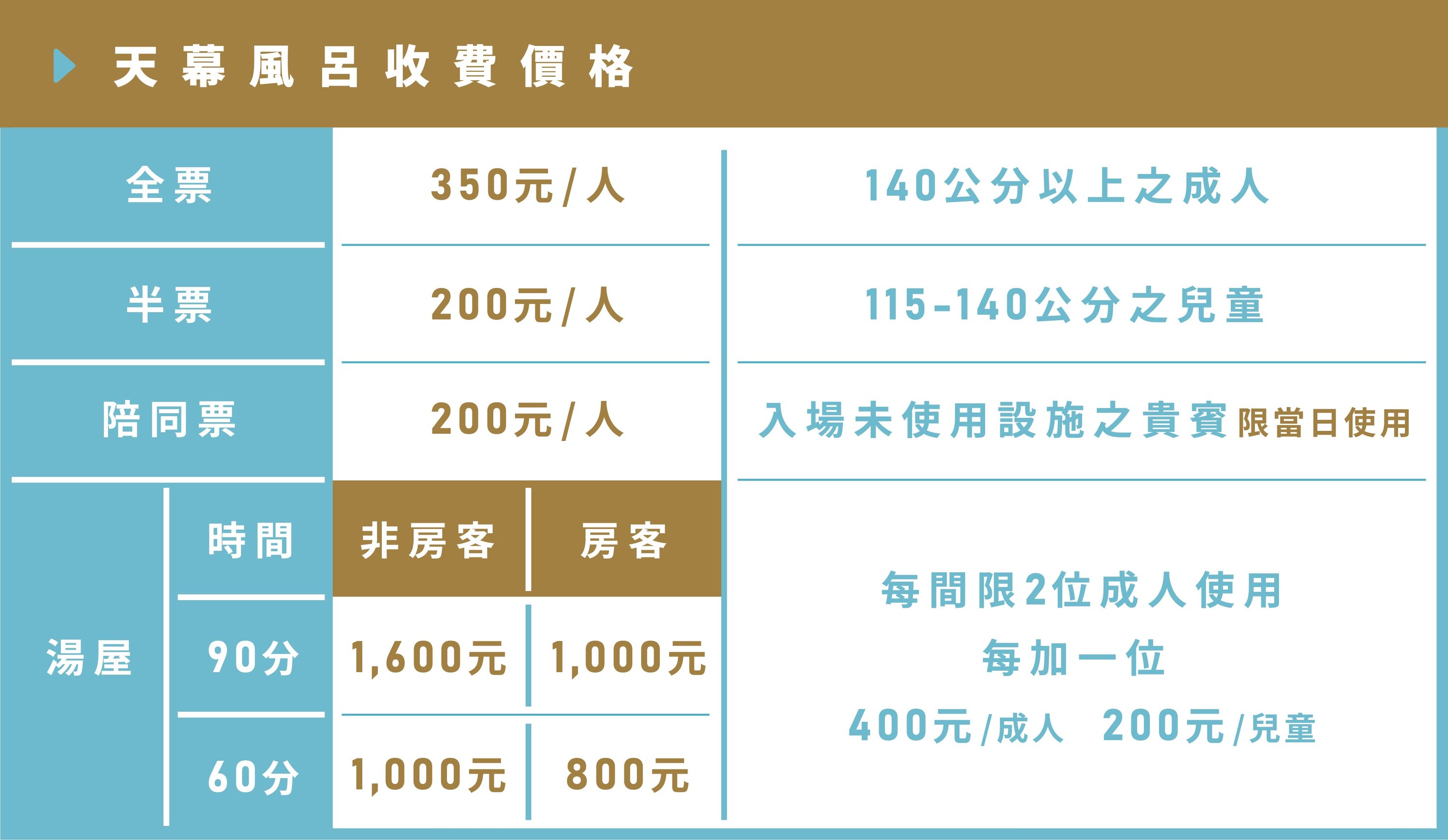 - 為維護泡湯品質及舒適,每間湯屋最多加一人使用