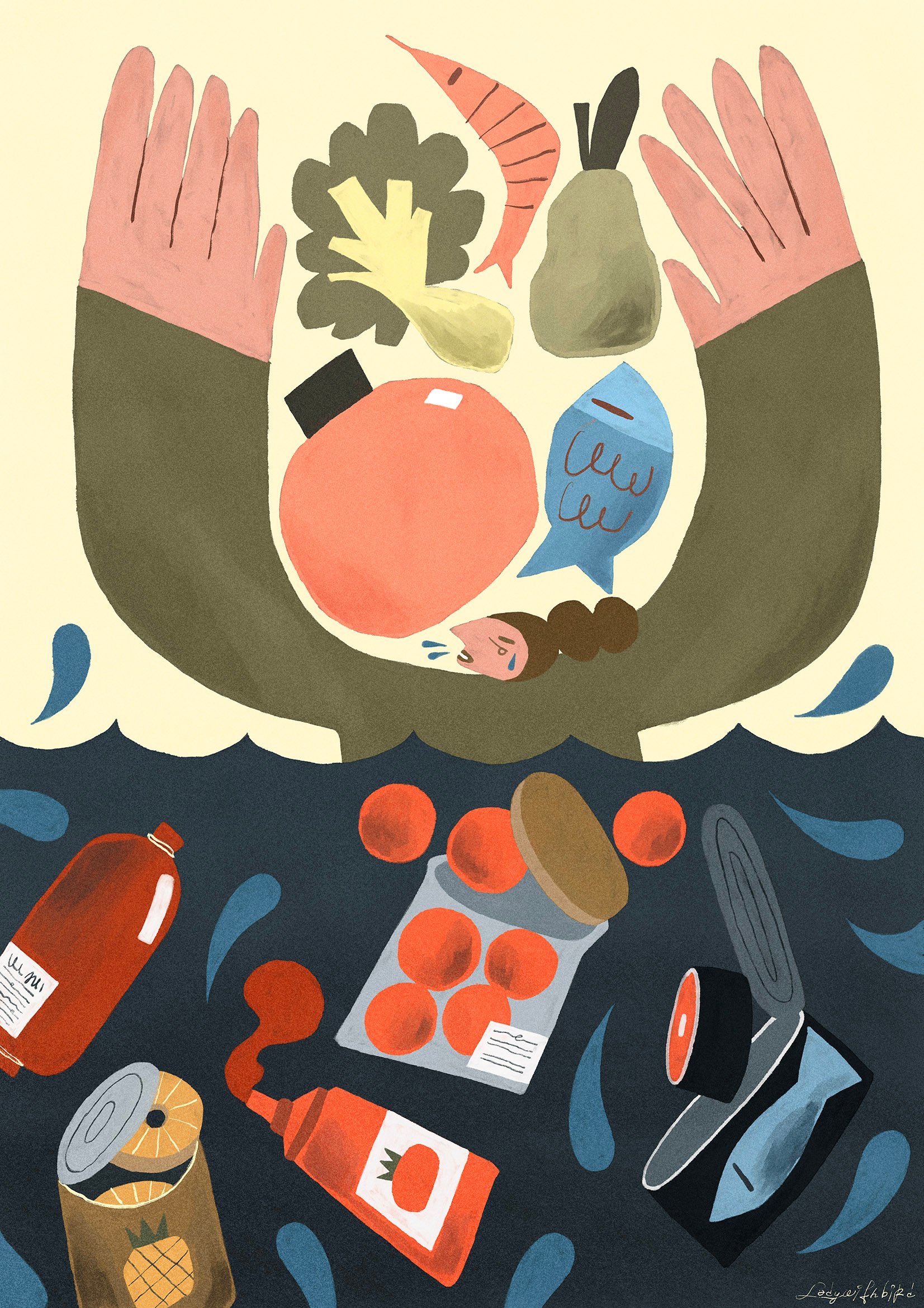 1F創作者的畫溫暖詩意又充滿奇幻,此次作品以一個掌心中的「碗」來闡述理念。飲食包含看不見的水,也影響著用水量,從農場、牧場到運輸,水足跡悄悄地邁開更大的幅度。據研究,健康的全素飲食能減少55%的水足跡,能大大減輕地球的負擔。選擇更多蔬食吧!你的選擇,讓地球繁榮豐盛。