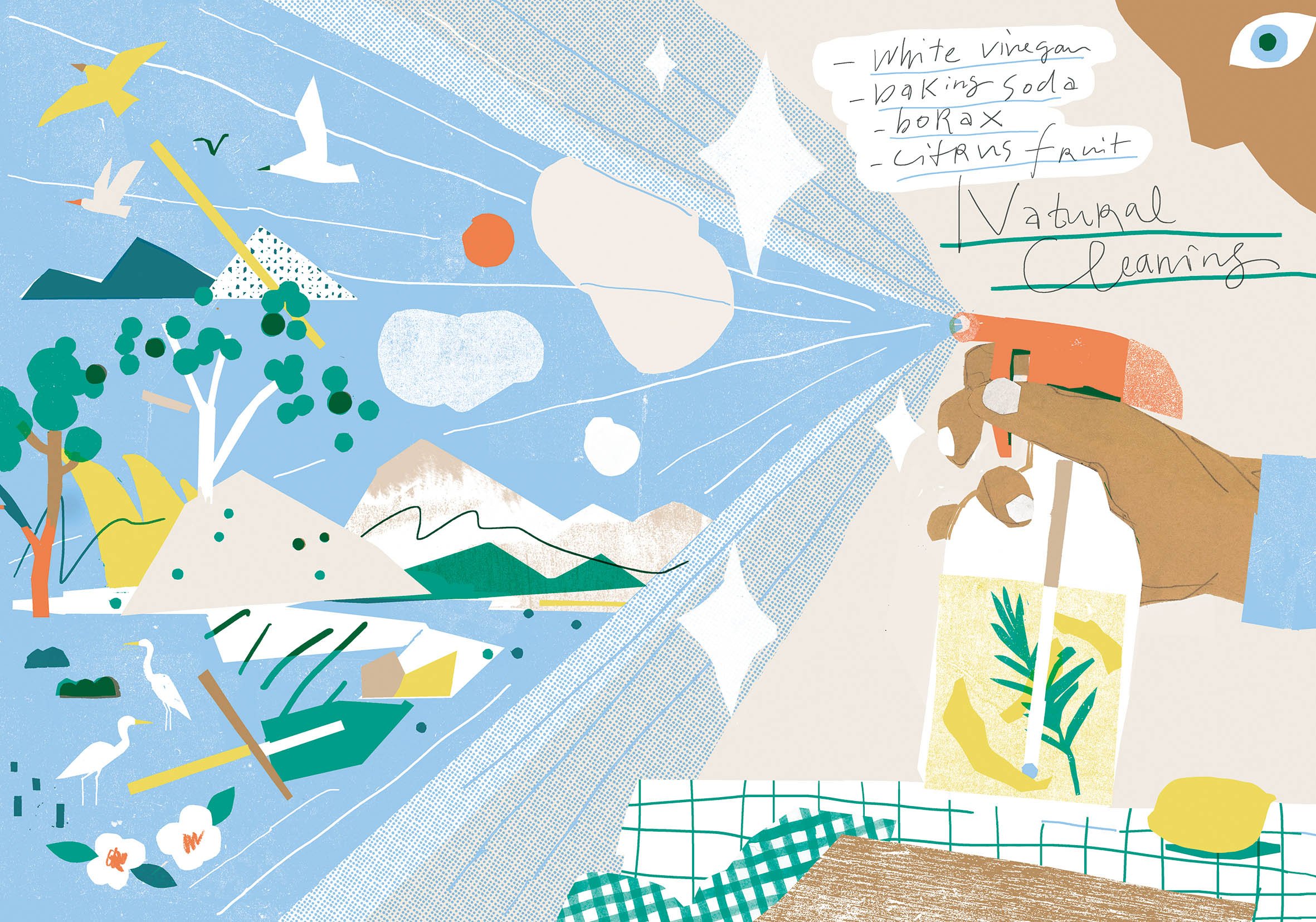 1F樸拙自然的色塊、輕巧無壓的構圖,插畫裡有著環保生活的美好韻律。同時,也包藏著豐厚的訊息量。創作者生動傳遞著使用天然清潔劑對自然環境的友善,還有,對未來的想像。
