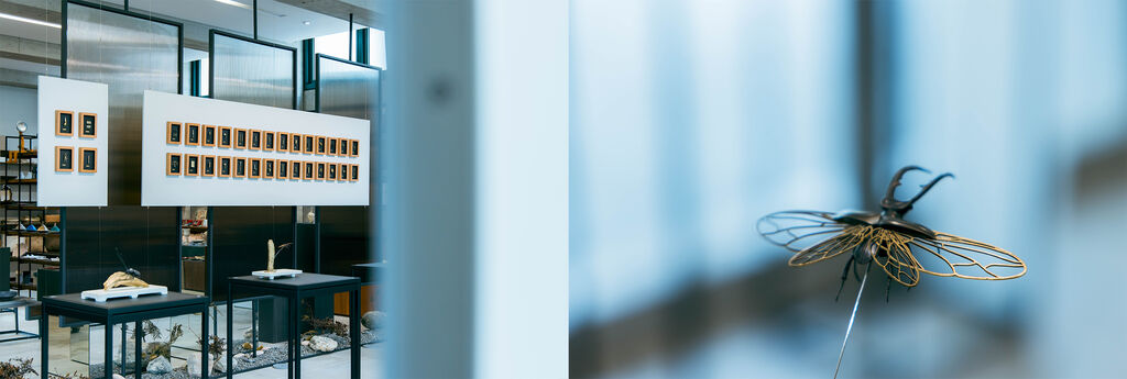 而近期在毓繡美術館商店空間展出至 7/27(週日)的「物與物」,是「臍加厝手路金工」創辦人王譽霖、周霽恩的創作展,也是 DesignArt、Collectible Design 走入美術館的佳例。工具為物、材料為物,兩人將各種工具與金屬層疊作用,試圖打造出一柄尺、蝴蝶的翅脈等,以物造物,傳達的是「物不僅止於物」的精髓,更重燃對生命的想像、提問與感受。