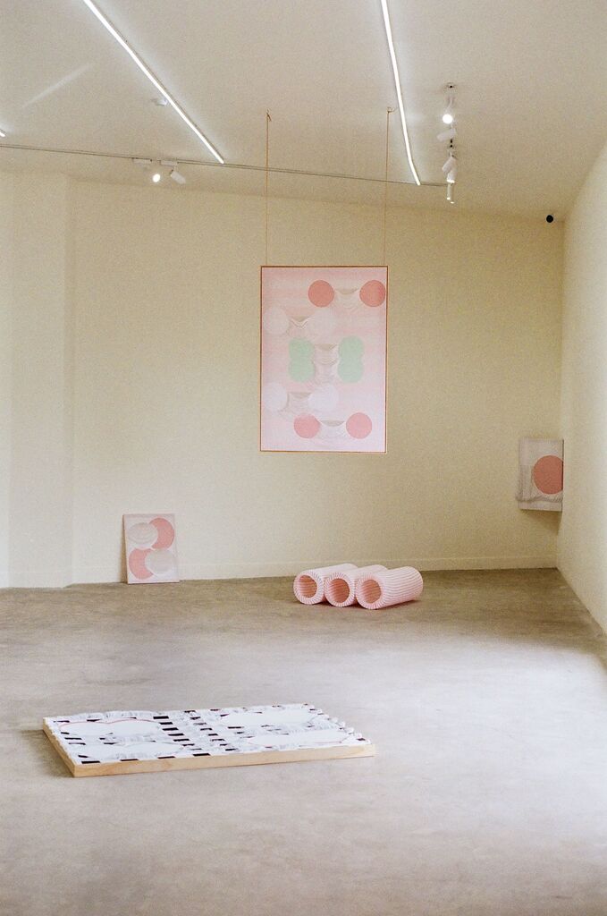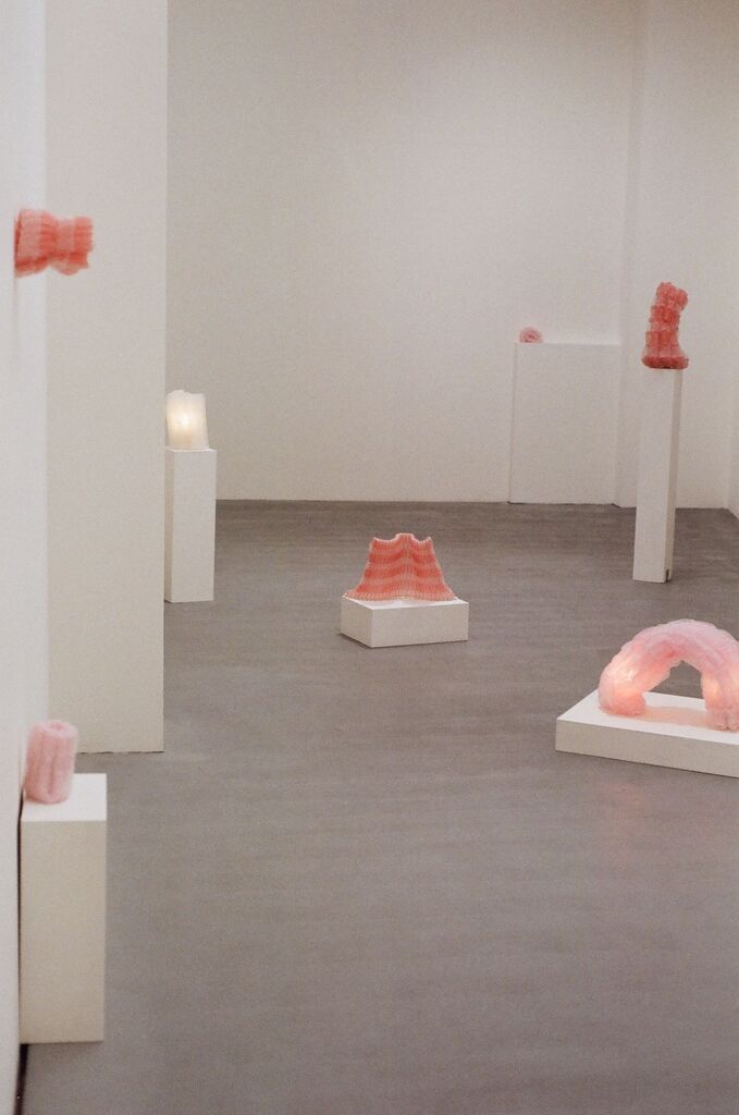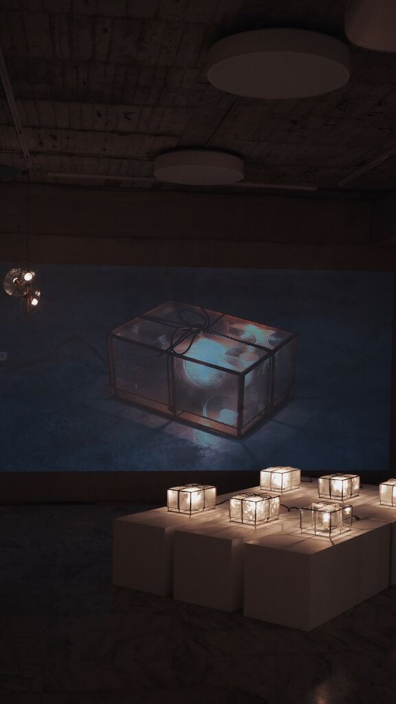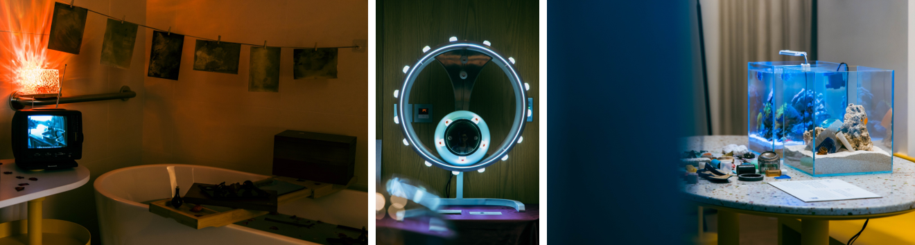 ΔDesignArt 2025「設計系學生藝術沙龍」展間現場: (左至右)張宇蕎《Ochre Frames》、戴抒瑜《社交光鐘》、梁丁元《海廢 · 家》。