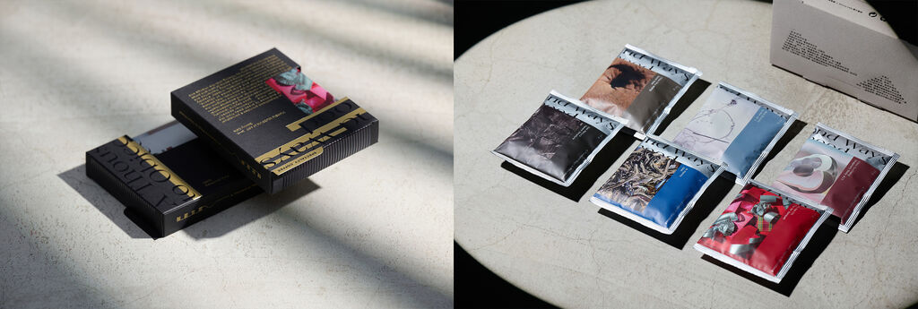 「遊物時間」展覽推出展覽周邊咖啡精選掛耳包,由咖啡師黃俊堯以藝術家作品激盪感官、轉化為風味 咖啡豆,4W STUDIO 則量身設計精緻包裝,讓藝術畫布創造日常味覺旅程。(照片提供:毓繡美術 館)