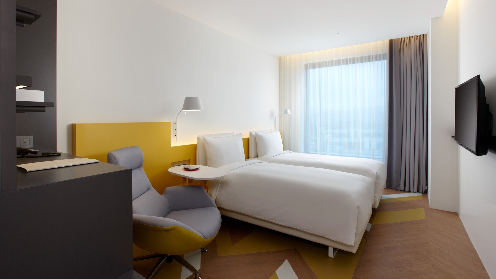 以黃色和灰色為主調,營造時尚而舒適的氛圍,同時也增加了現代感。而黃色作點綴色,為整個空間注入了一抹活力和溫暖。簡而不減的空間,玩轉設計巧思,人字拼地板,讓線條增添視覺延伸;大片玻璃穿透自然光影,豐富色彩的層次。 為入住的旅人提供一個富有現代感且令人愉悅的居住環境。