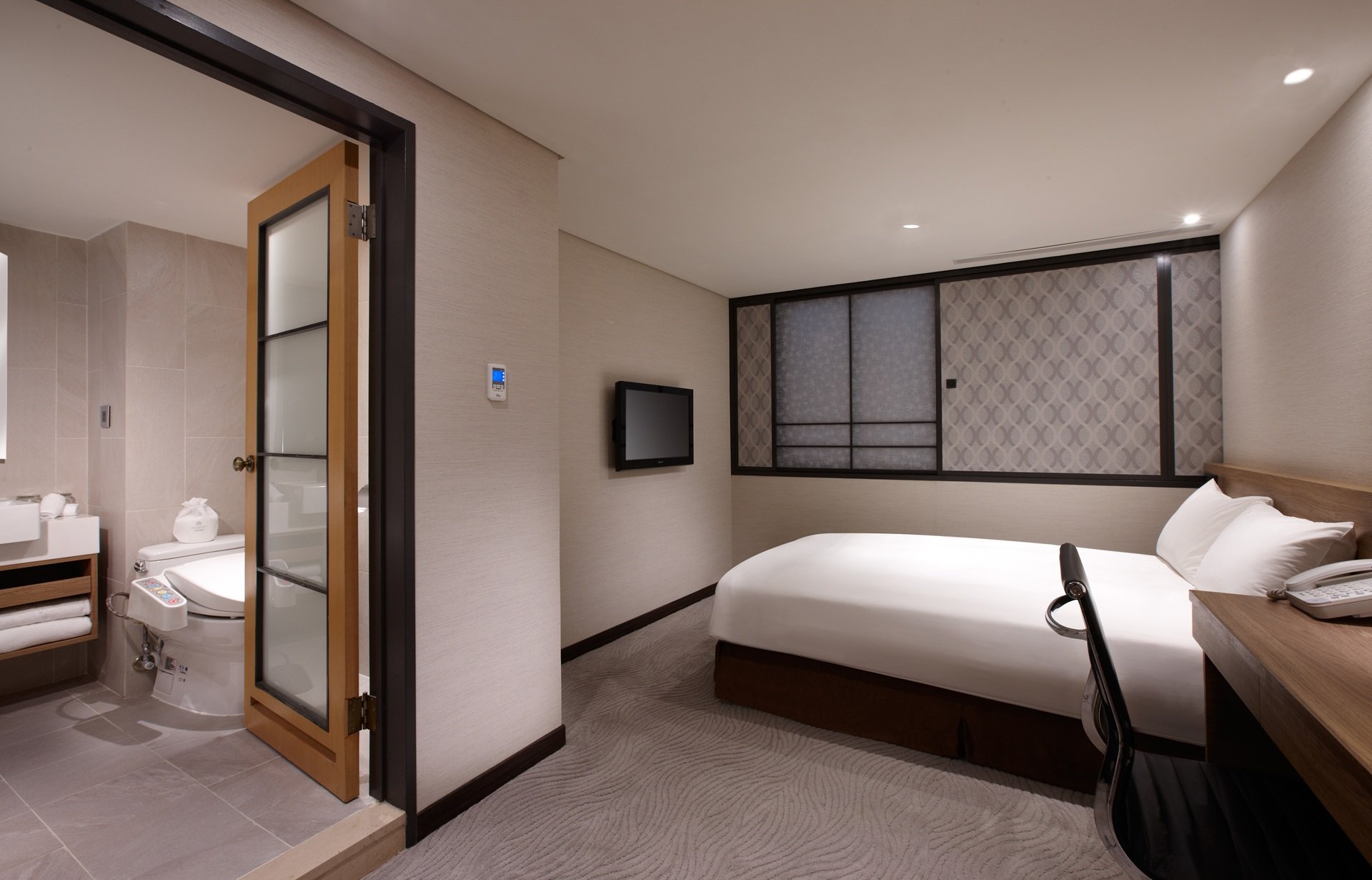 擁有沉穩內斂的日式設計,十四坪的空間設置獨立起居室與臥室,保留會客晤談及休息的彈性,床型為一張加大雙人床,客房配置免治馬桶及高級浴缸,適合商務出差或假期旅遊入住。