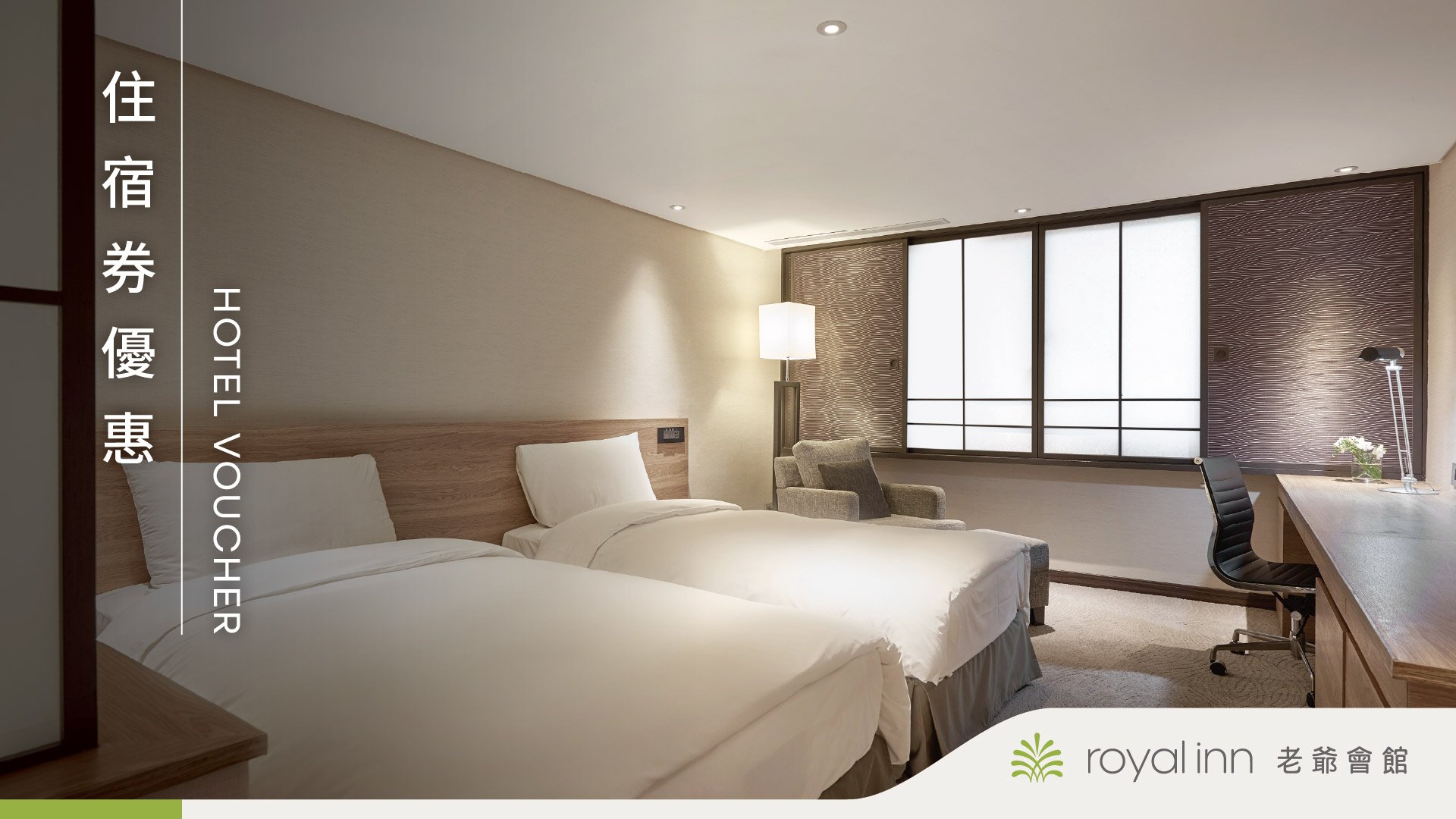 擁有日式極簡設計,逾九坪的空間設置舒適大方的家具,床型為兩張標準雙人床,最多可容納兩大兩小,客房配置免治馬桶及高級浴缸,適合團體出遊或家庭親子入住。