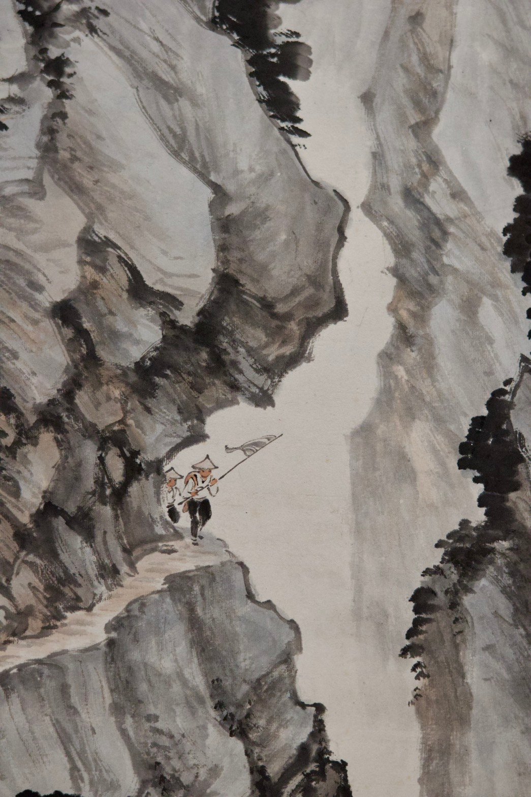 中部橫貫公路壯麗的峽谷景觀,啟發無數藝術家創作。1958 年林玉山隨寫生團深入太魯閣,並於翌年完成此作。 畫中高聳山壁與幽深谷地交織,寫生隊伍沿山徑前行,為雄偉自然增添人文氣息。 藝術家以寫生觀察結合傳統山水筆意,呈現氣勢恢宏且富生命感的山水風貌。