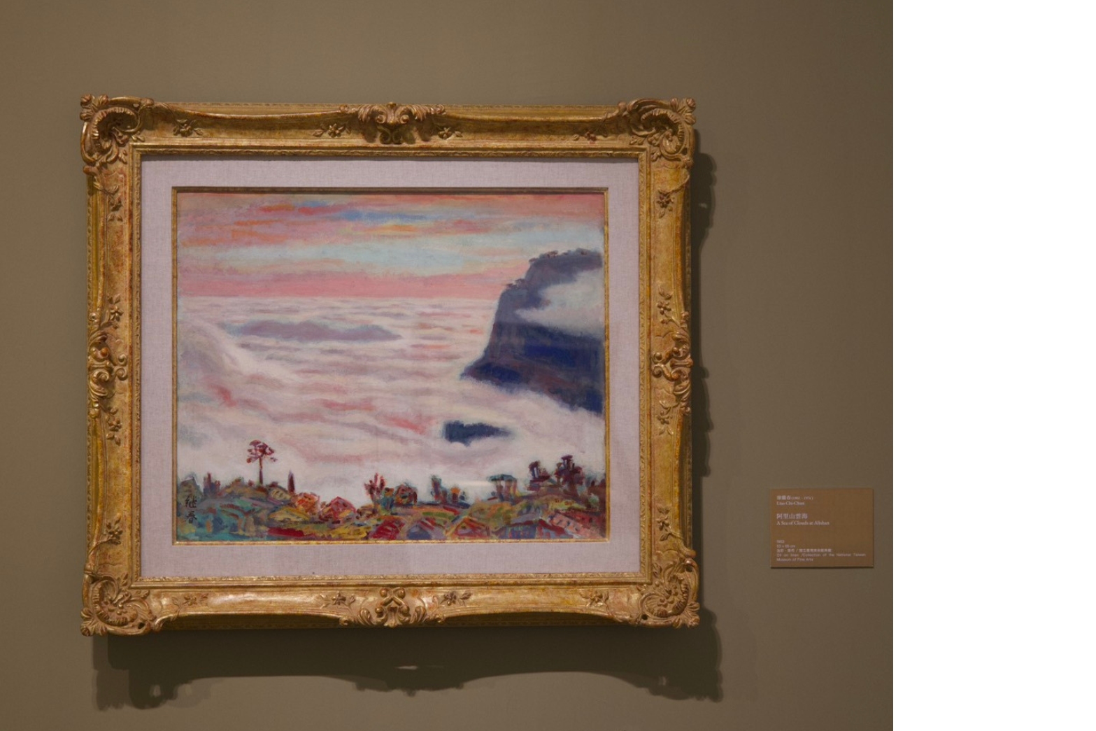廖繼春作為臺灣現代美術重要推手,創作風格由寫實轉向受野獸派與抽象藝術影響,色彩奔放鮮明。此作以粉紅色調描繪阿里山雲海,雲霧延展天際,山稜若隱若現。前景以簡化筆觸勾勒樹木與屋舍,形體自由而富節奏感,展現藝術家成熟鮮明的個人風格與現代繪畫精神。