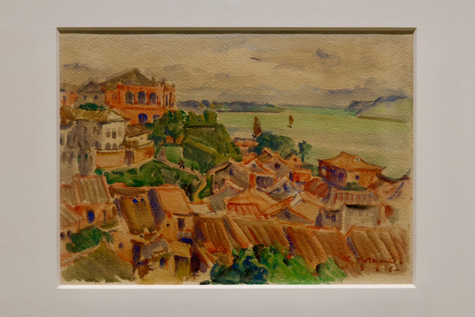 淡水位於河口,與觀音山相望,「淡江夕照」為臺灣早期八景之一。此作為日本畫家真野紀太郎旅臺期間的寫生作品。 畫中可見閩南紅瓦屋與洋樓並存,展現淡水作為通商港口的多元文化風貌。 遠景紅樓推測為紅毛城一帶建築,河面帆船與層層山嵐,描繪出港市的歷史記憶與日常景致。