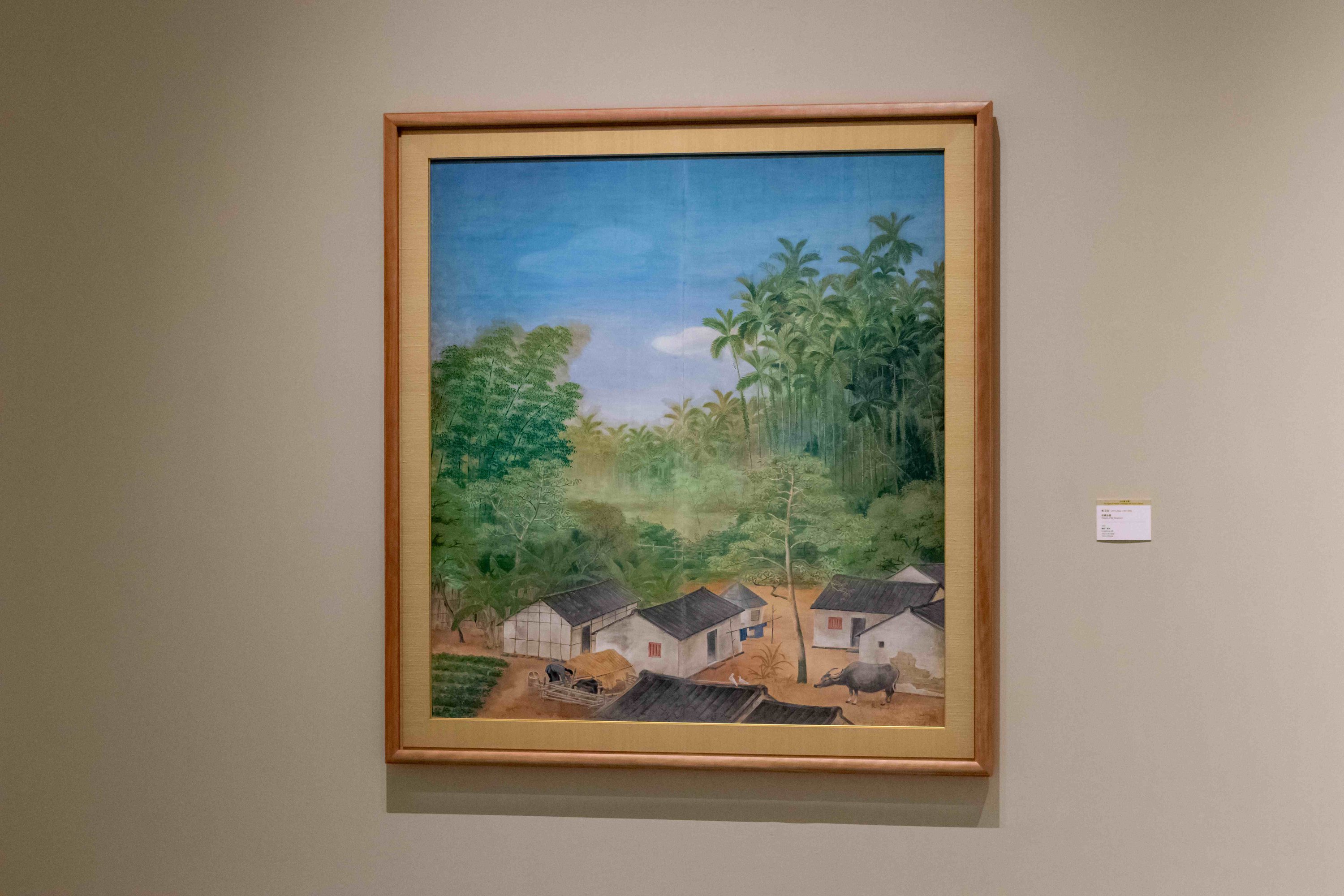 為林玉山於1935年入選第9回臺展東洋畫部之作。畫中描繪日治時期嘉義山仔頂的農村景象,展現其於京都進修期間所學的細膩筆法。 畫面可見農舍、水牛與村落景致,竹林、香蕉與檳榔樹層層鋪陳,遠近分明。 大片藍天留白營造晴朗開闊的空氣感,也流露藝術家旅日時對故鄉的思念。
