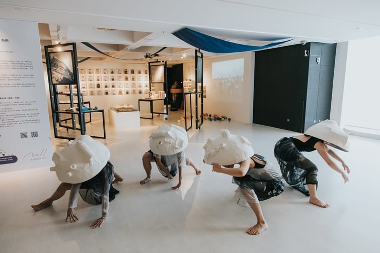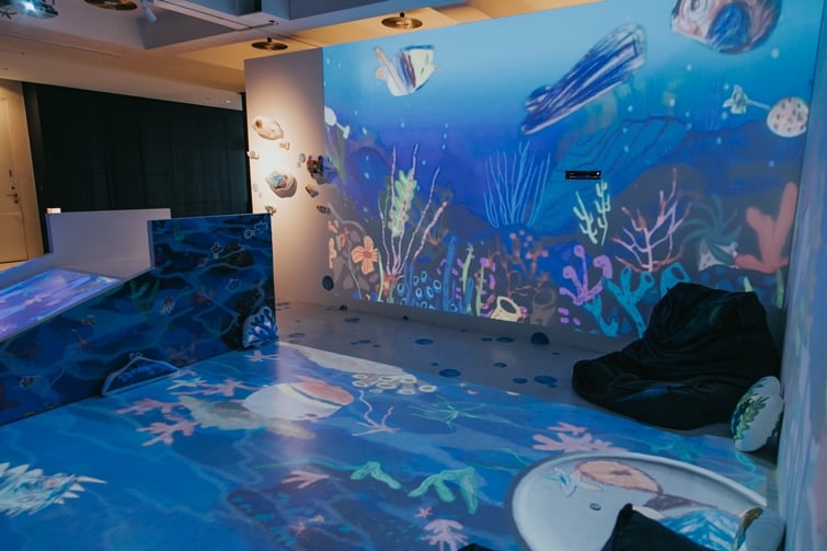 8F《療癒海洋》將海搬進了展場,透過互動媒體裝置,拉近我們與海的距離,裡頭優游的,是藝術家和孩子們一起創造出對海中生物純真的想像,藉由孩子們的繪畫,呈現了豐富生動的水中世界。